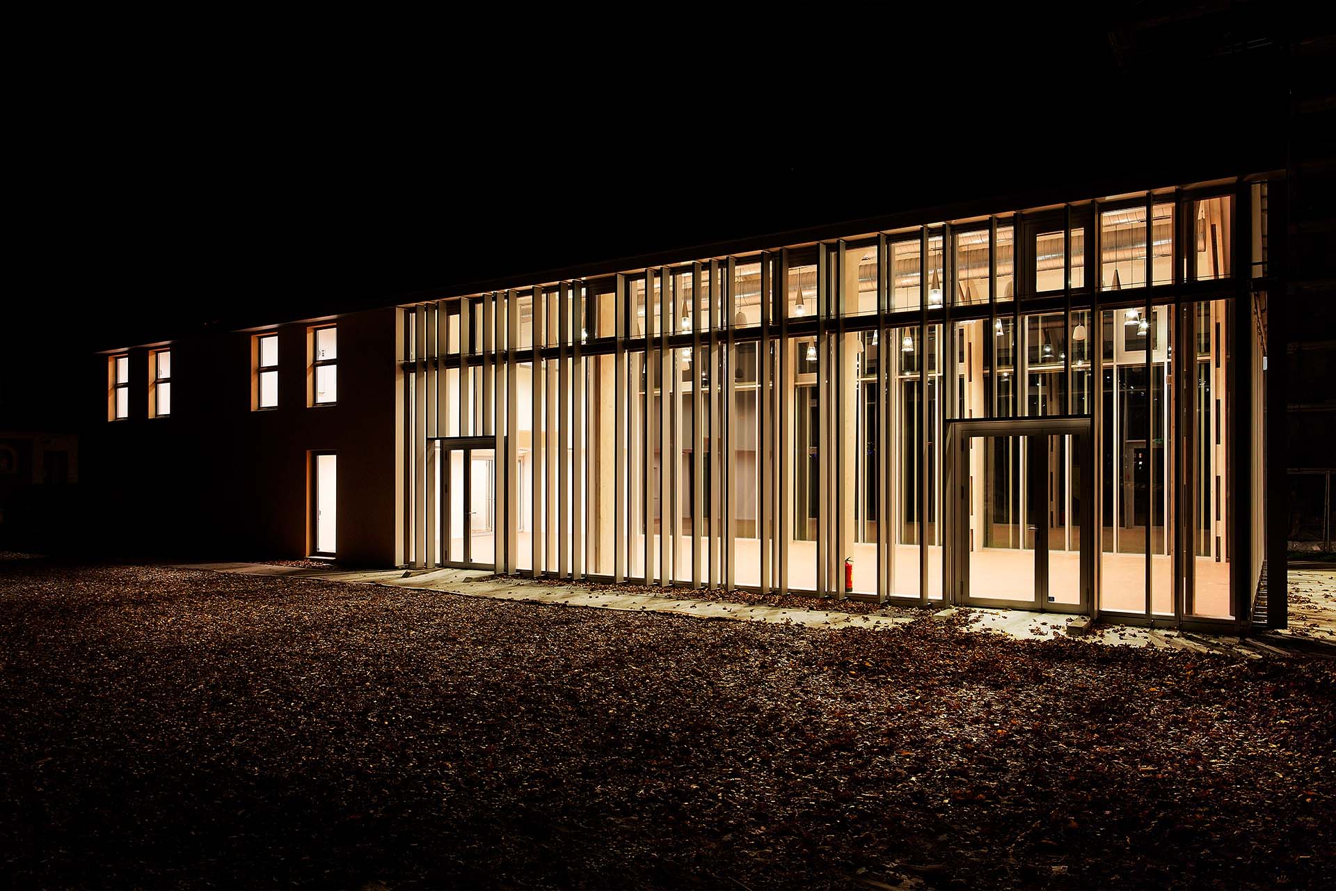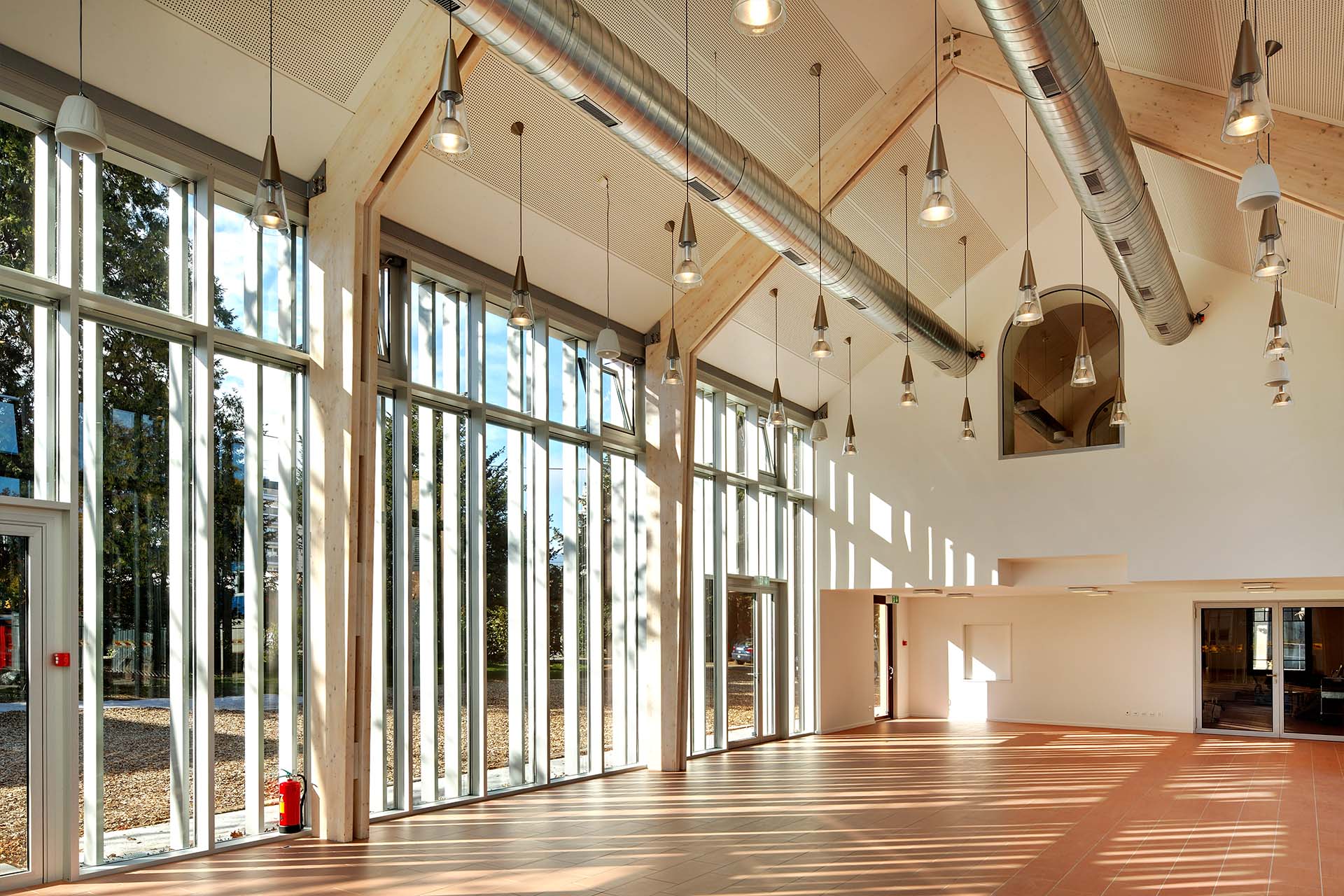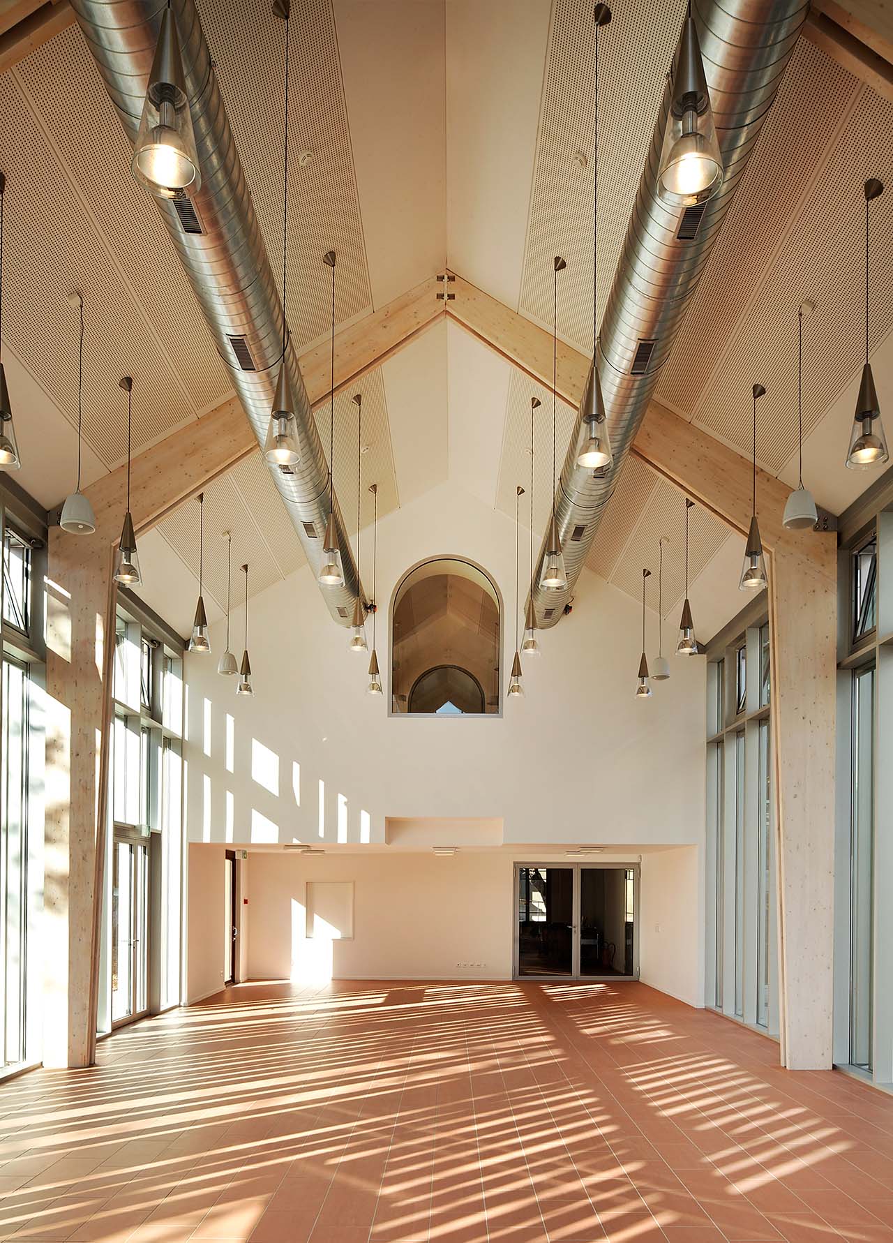 Datant du début du 18e siècle, la façade en pierre face à l’église a été conservée et restaurée. Un grand volume de bois, verre et métal, accueillant la nouvelle salle paroissiale, prolonge le gabarit donné par la façade historique.