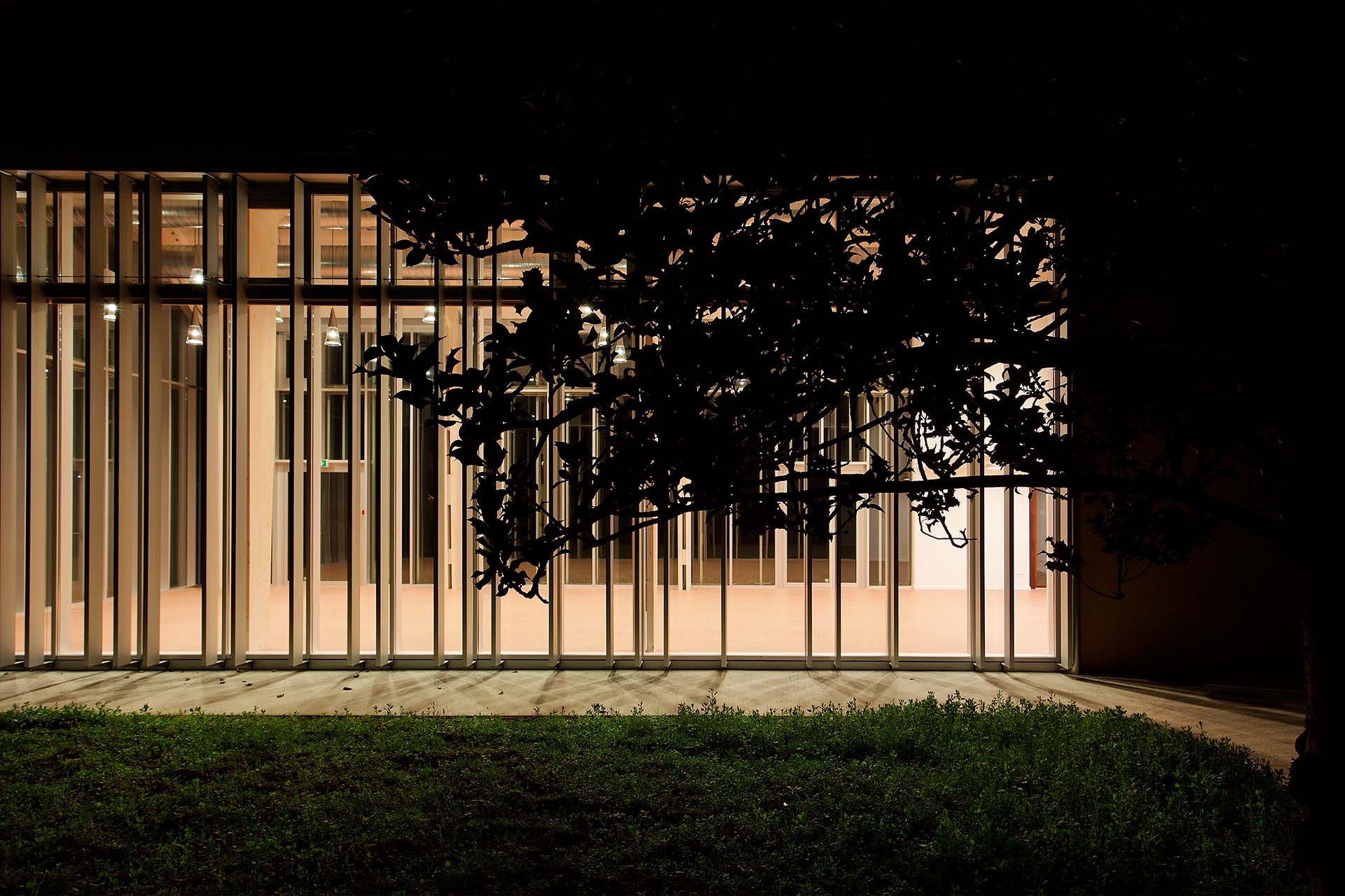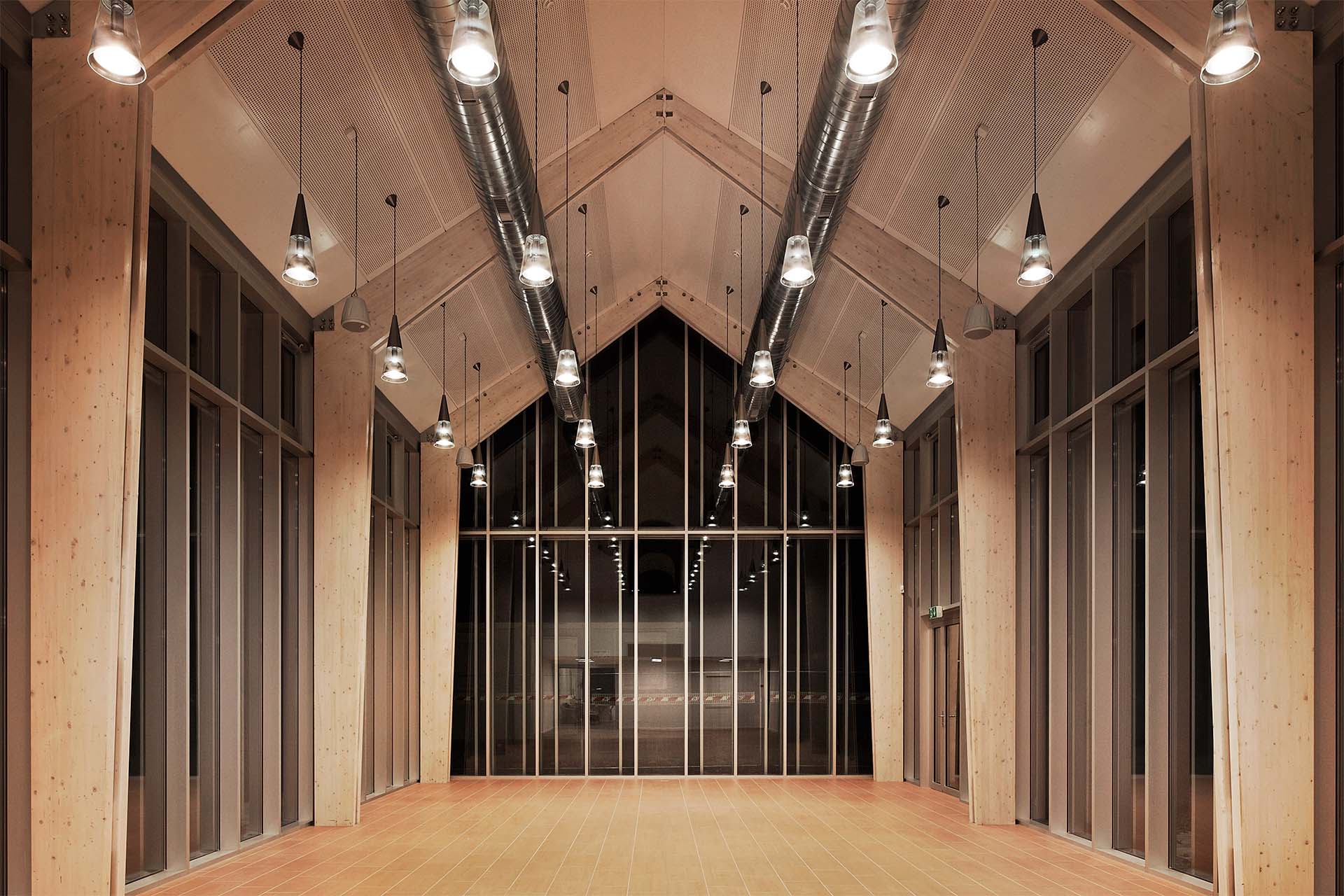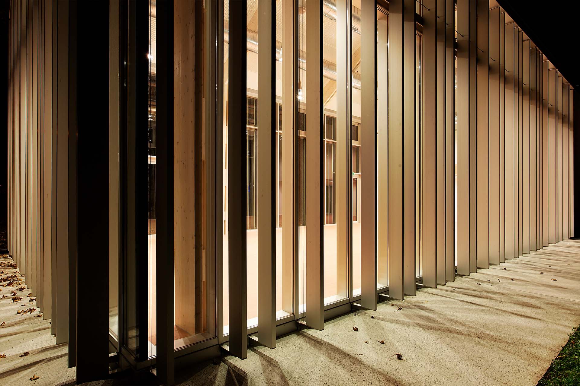 Datant du début du 18e siècle, la façade en pierre face à l’église a été conservée et restaurée. Un grand volume de bois, verre et métal, accueillant la nouvelle salle paroissiale, prolonge le gabarit donné par la façade historique.