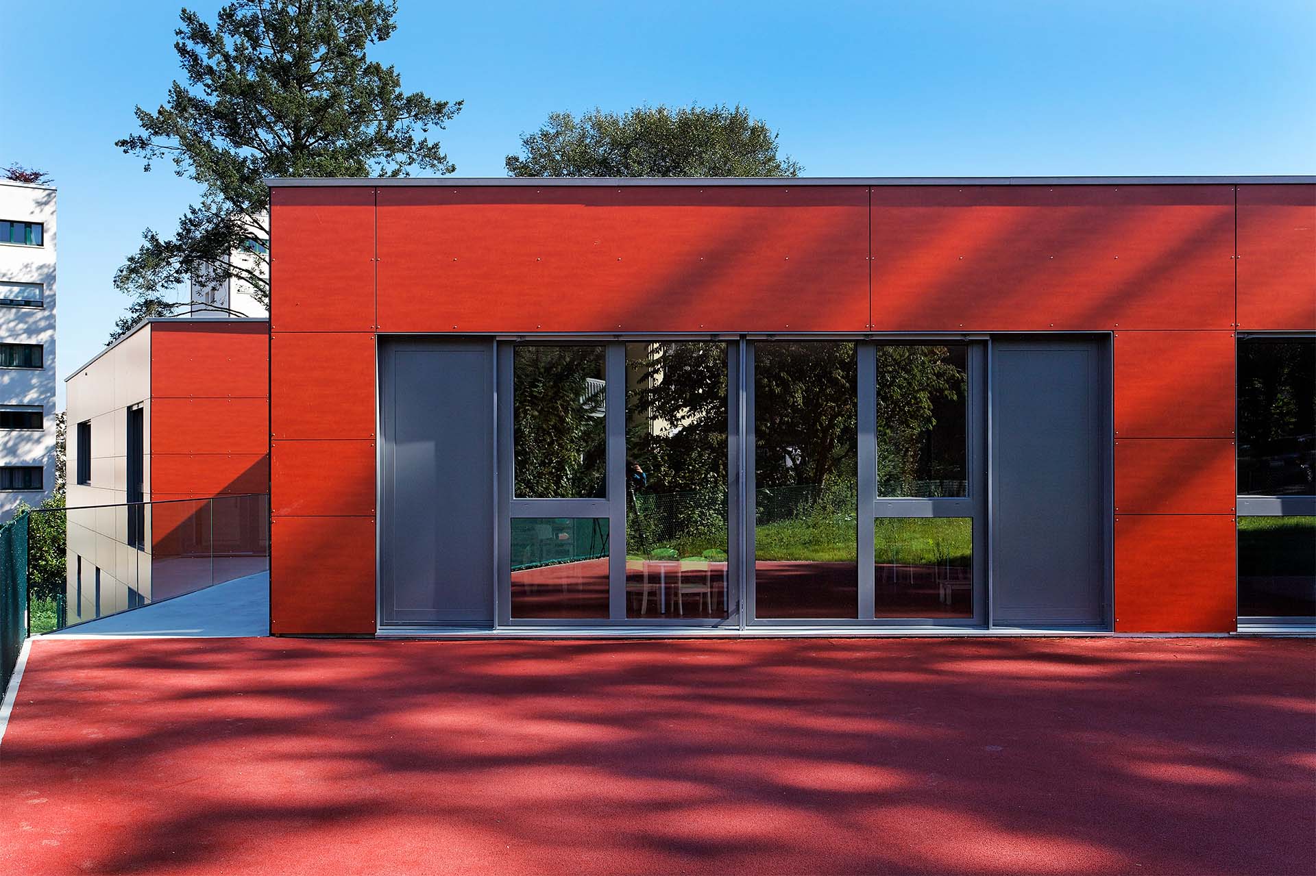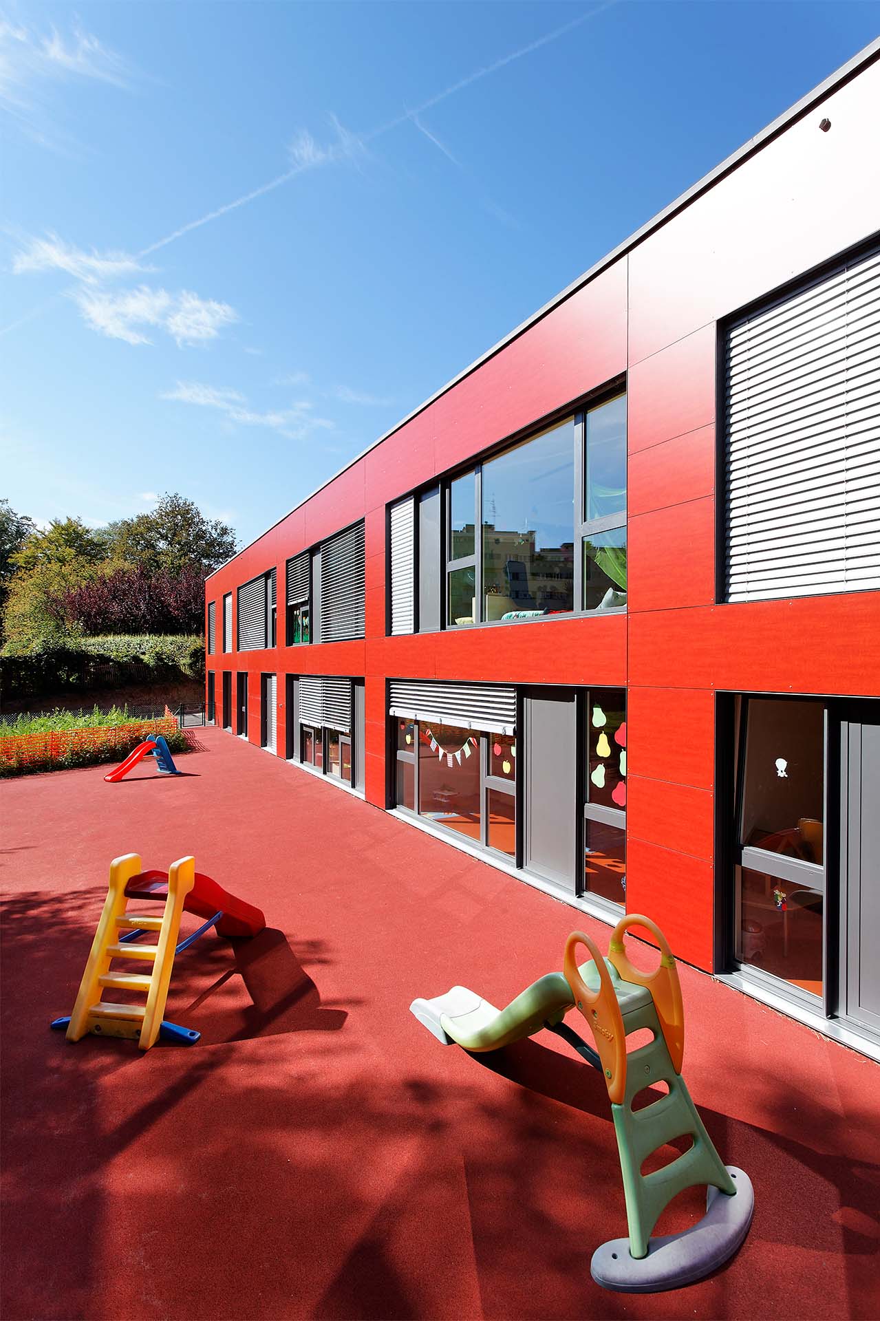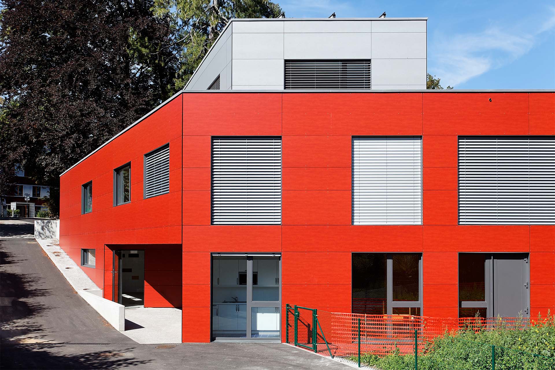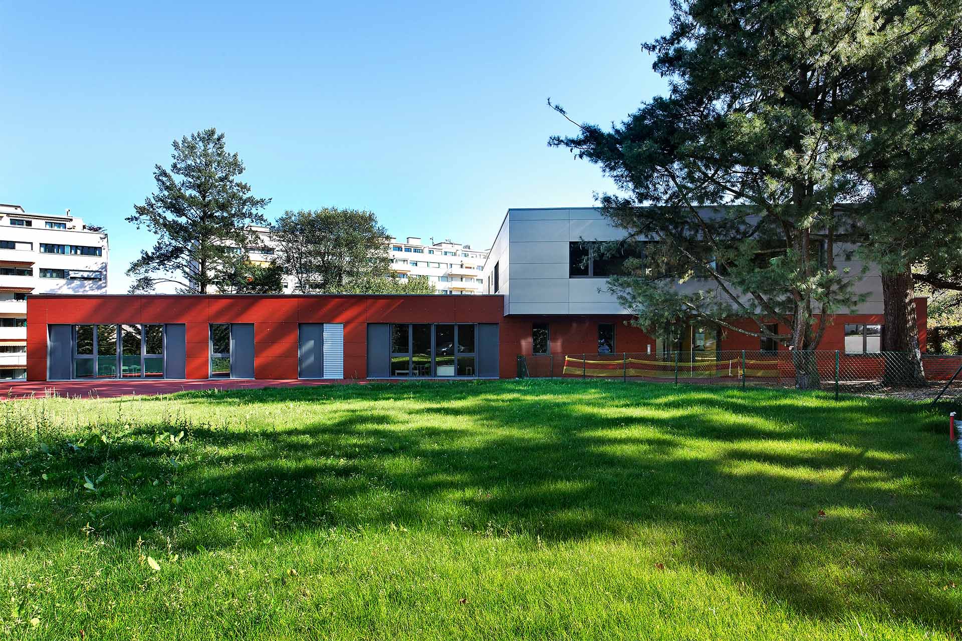 Lauréat du concours d’architecture organisé par la commune de Versoix, le projet profite de la topographie naturelle du terrain pour développer ses activités sur trois niveaux tout en garantissant un accès direct sur l’extérieur aux différentes salles de vie enfantines.