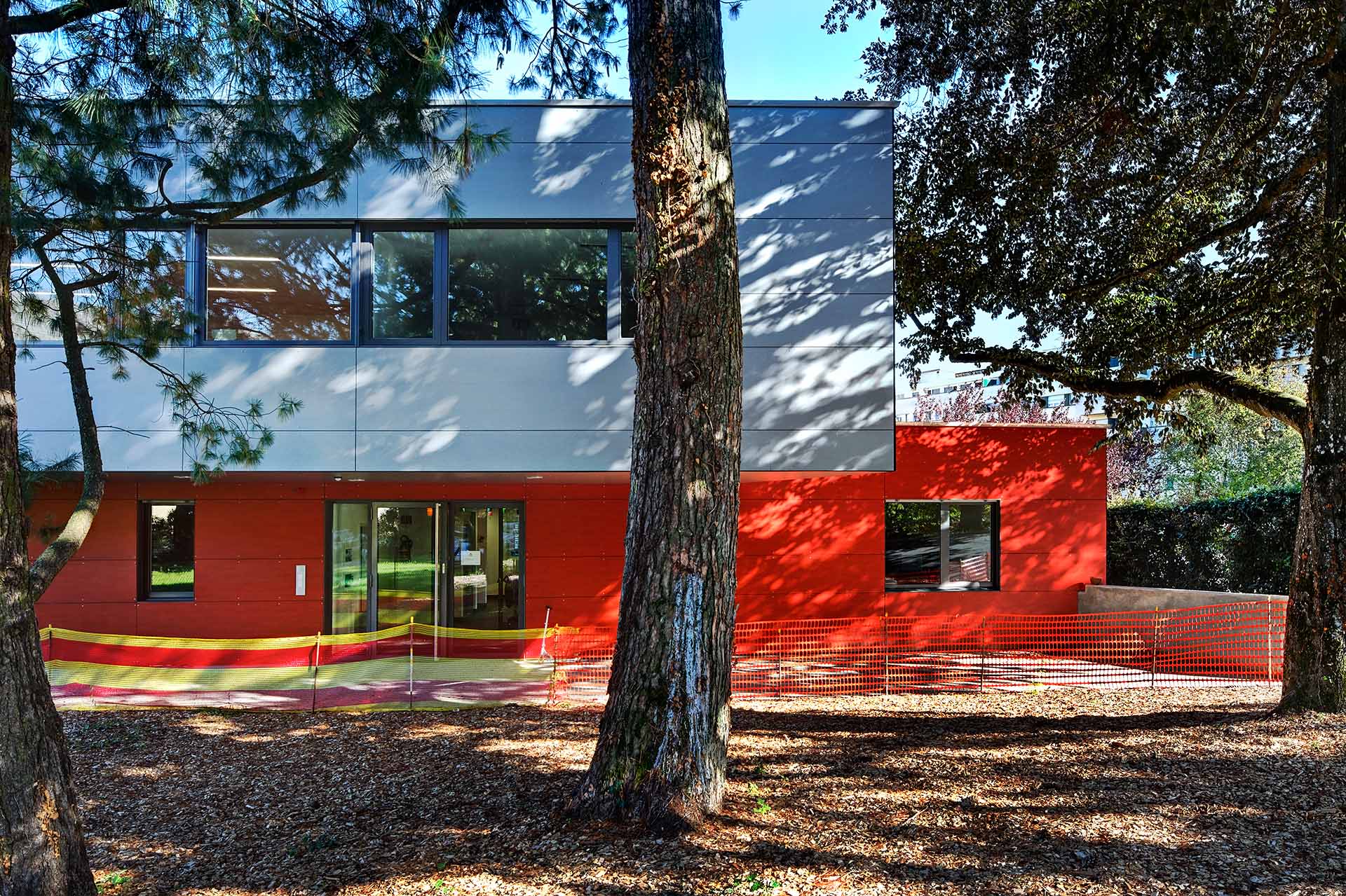 En préservant les arbres, le projet s’inscrit dans le site avec un porte-à-faux surplombant l’entrée, du registre de la « cabane dans les arbres », unifiant l’édifice à la nature environnante. La réalisation répond aux exigences élevées du label énergétique Minergie.