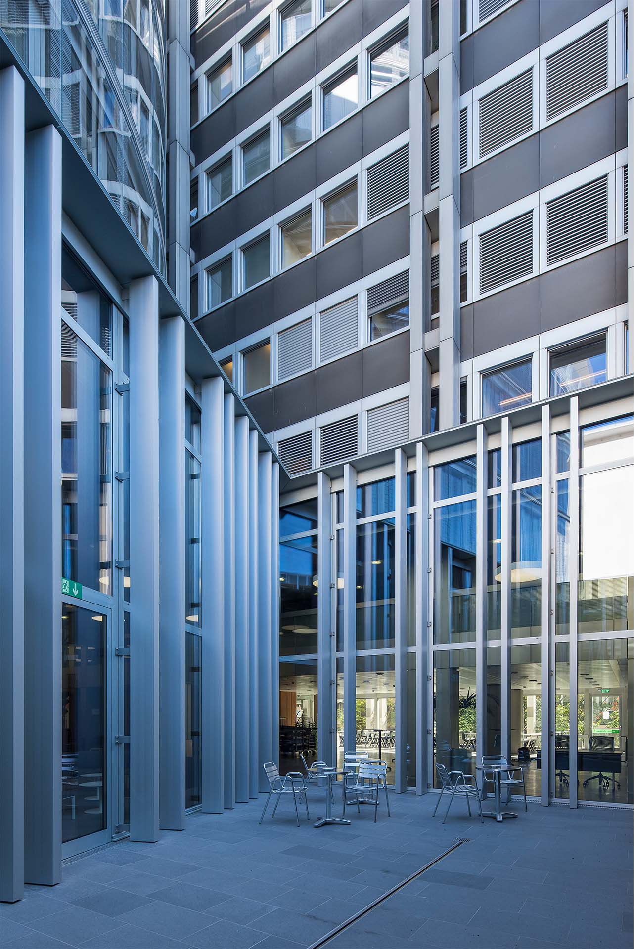 Le projet avec son implantation se décompose en deux éléments très distincts: un socle et une émergence. L’articulation de ces deux volumes différenciés a permis de souligner avec beaucoup de clarté les différents niveaux d’usages en relation avec le programme et ses spécificités. Le socle de par sa volumétrie est un élément majeur qui compose avec force la relation avec les espaces publics et la rue. Il permet d’identifier avec précision le caractère et les contours de l’îlot. L’émergence très compacte, située au centre du socle et à l’axe de l’îlot intérieur, accentue cette impression de respect pour conserver les perspectives visuelles depuis le bâtiment siège de la FIPOI ainsi que pour les bâtiments avoisinants.