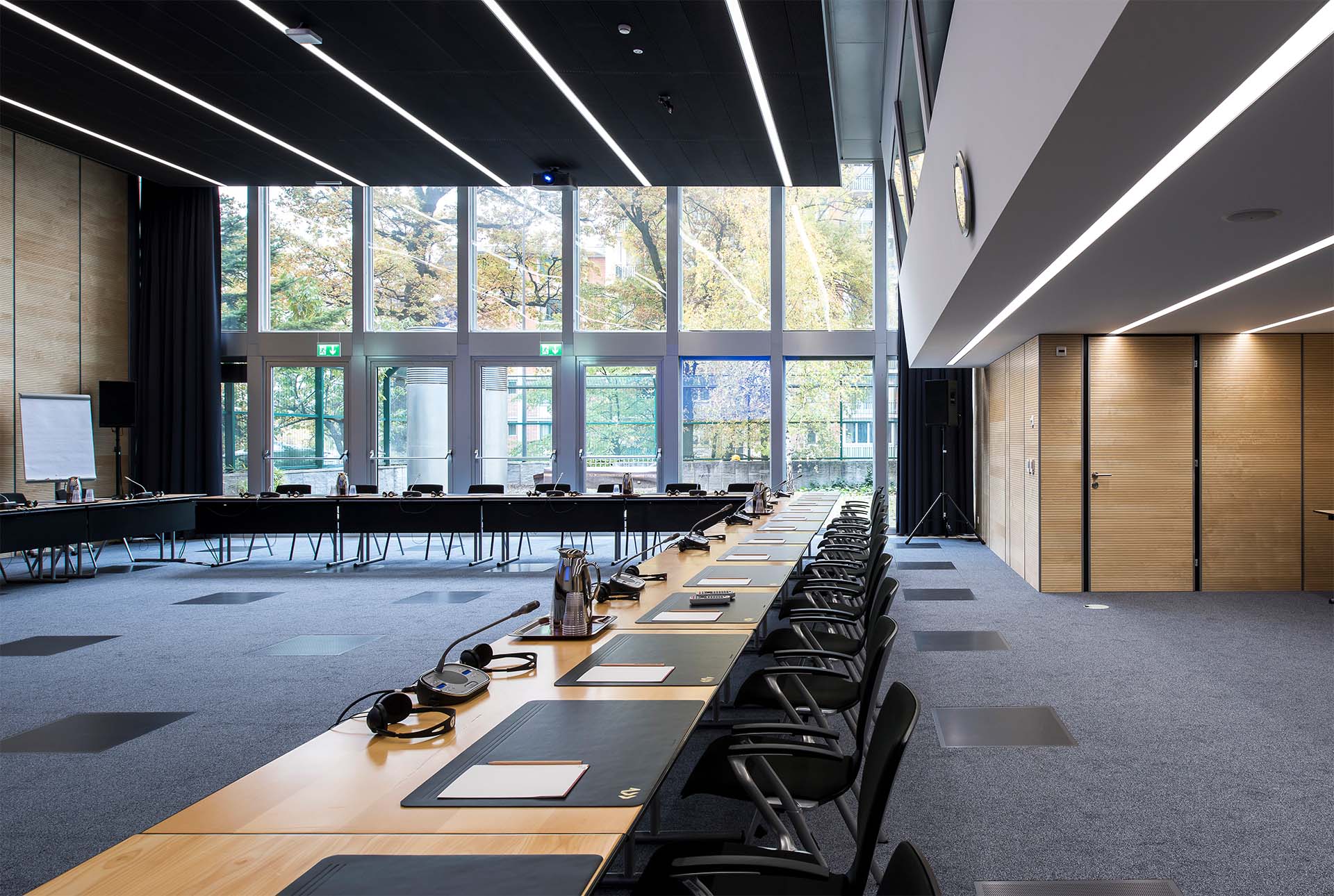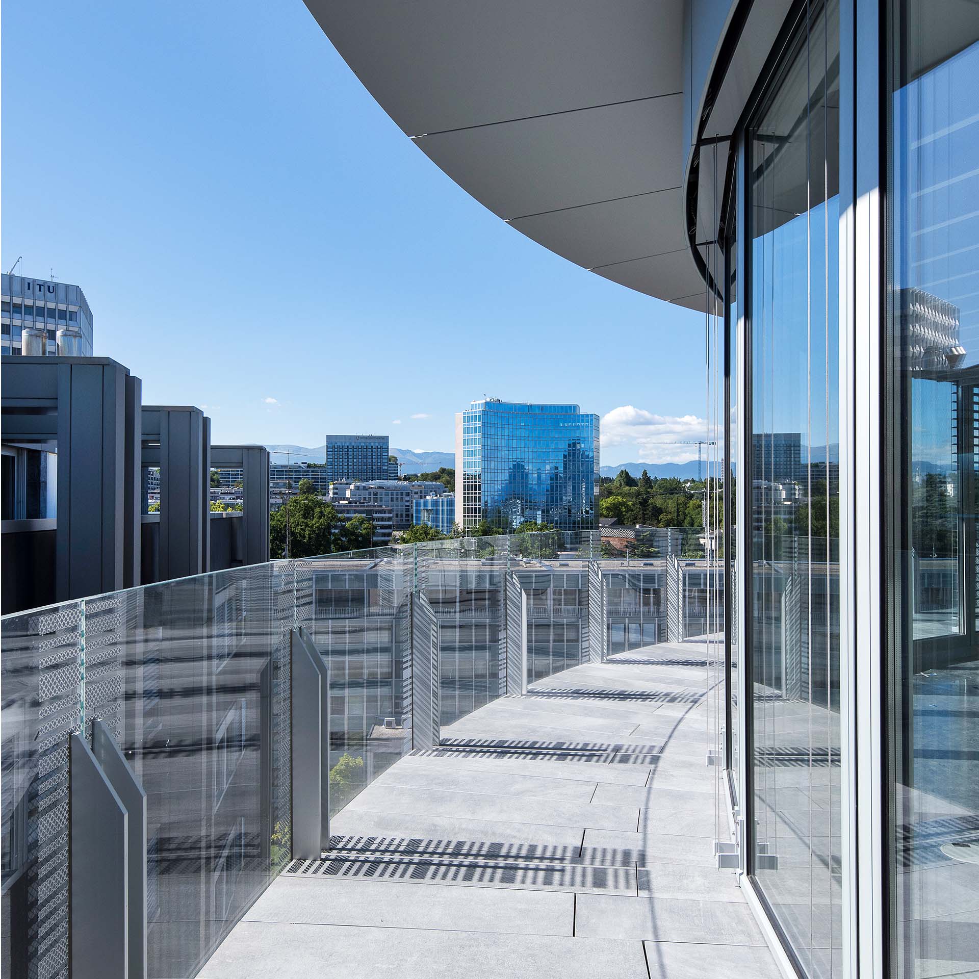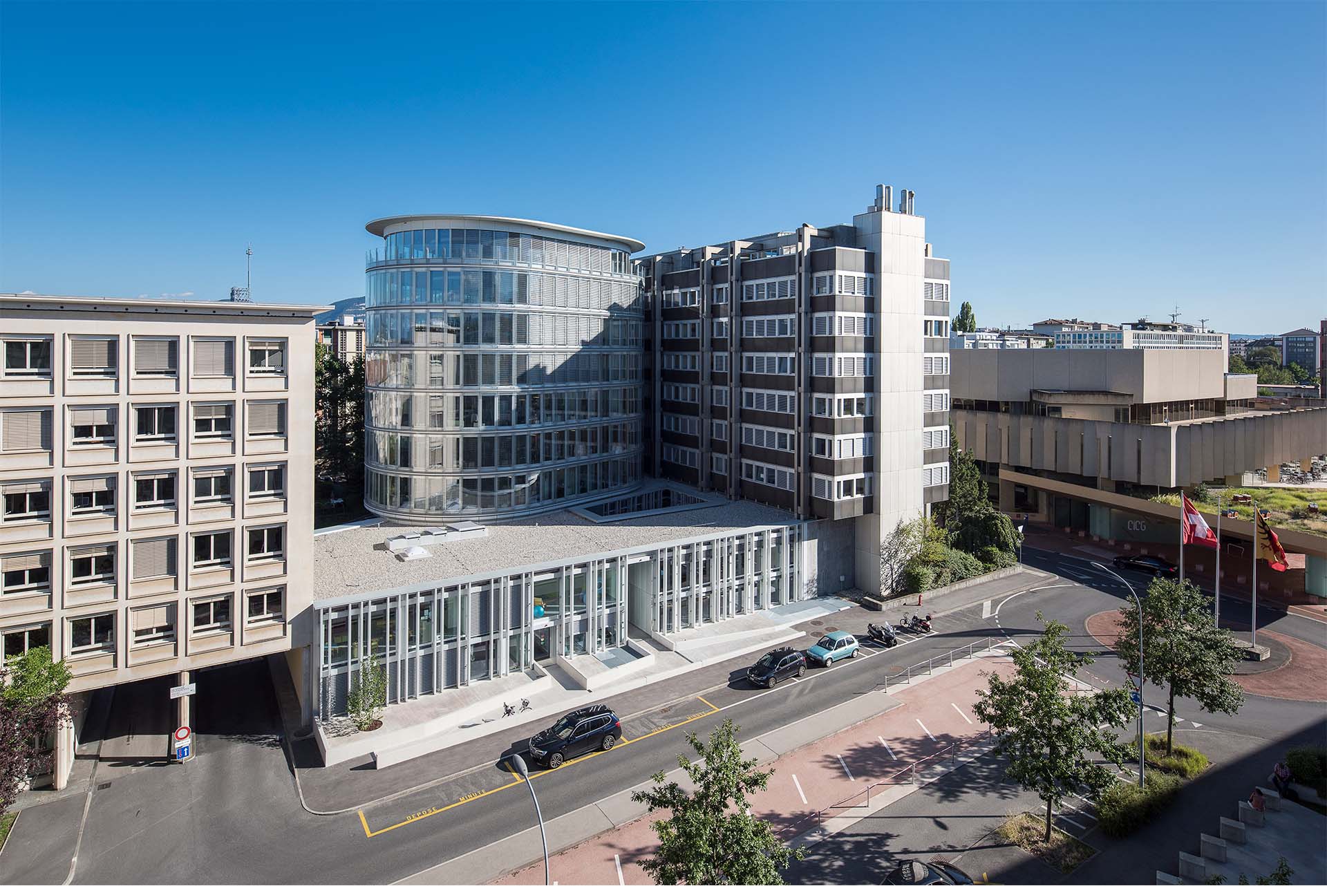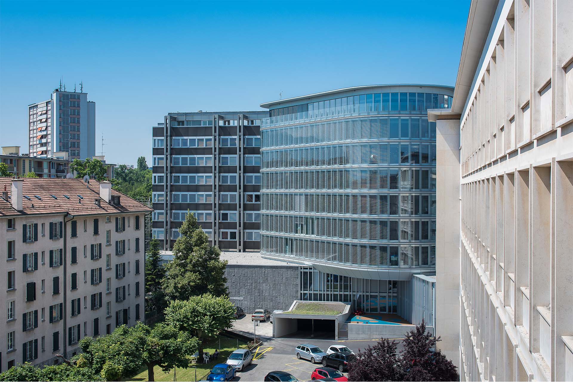Préserver les perspectives et les droits de jour des immeubles existants composant cet îlot près de la place des Nations a été un des soucis majeurs qui a contribué fortement au concept développé pour ce projet. Son implantation dans le site avait également comme contrainte de préserver des salles de conférences pour la Genève Internationale ainsi que d’intégrer une crèche accessible avec une entrée indépendante.