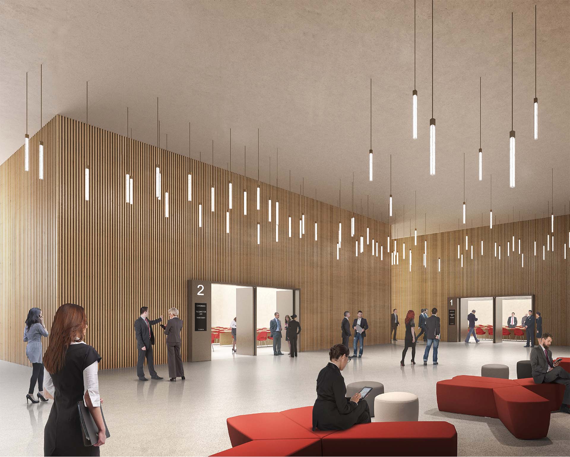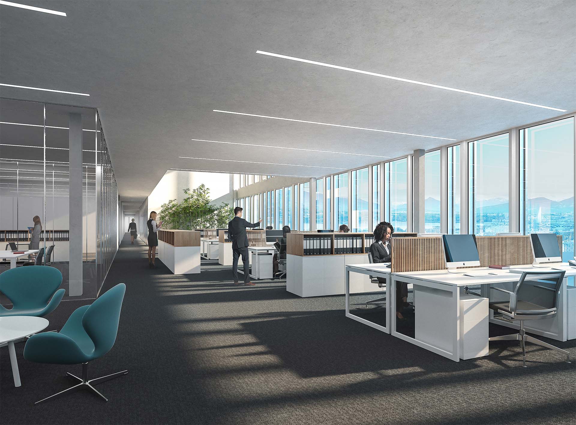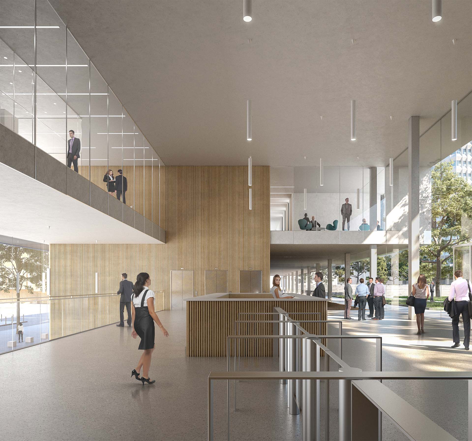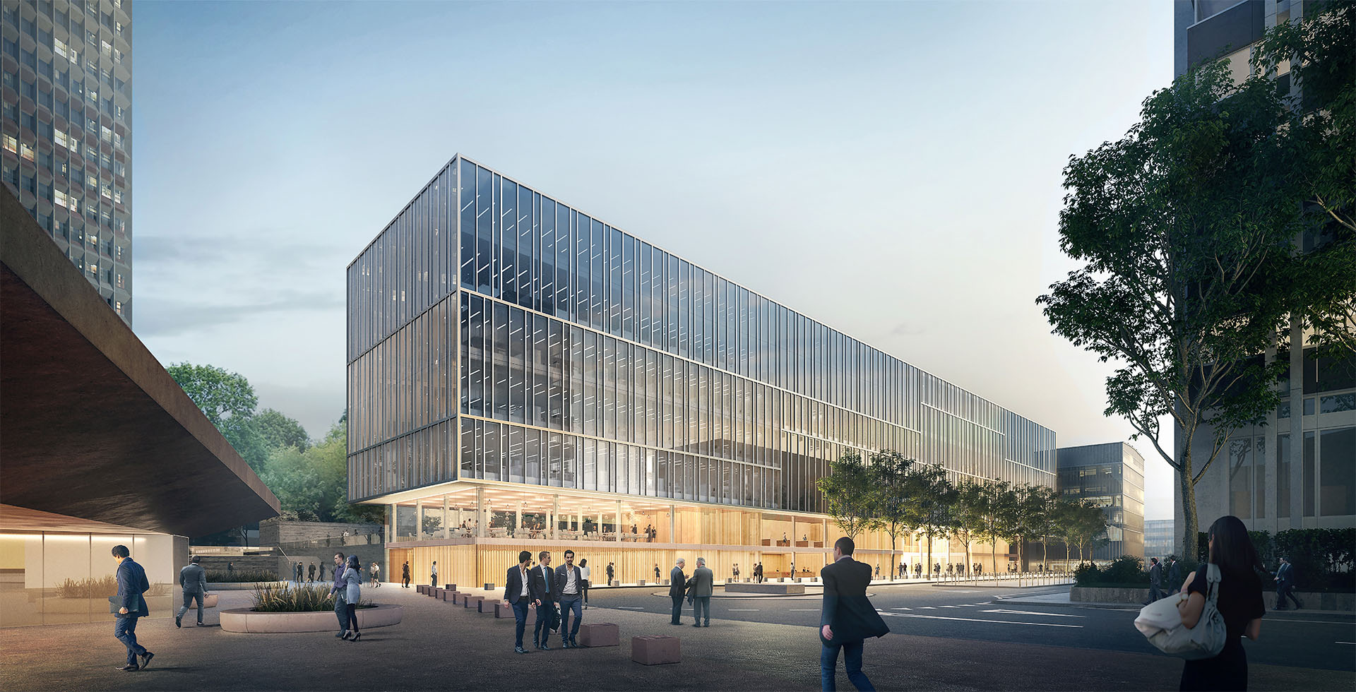 L’implantation d’une identité « socle » fortement reconnaissable architecturalement, absorbe les différences de niveaux de cette configuration du lieu et met en valeur cette dualité du site « l’Urbain et le Paysage ». La volumétrie du socle articule la gestion périphérique du site avec ses deux niveaux de référence. Le rez-de-chaussée en relation avec la Rue de Varembé qui comprend l’accueil principal, les activités de réception, de conférences et d’espaces thématiques. Le rez-de-chaussée supérieur en relation avec la Place des Nations qui comprend l’accueil secondaire des collaborateurs de l’UIT, la cafétéria, l’espace culturel.