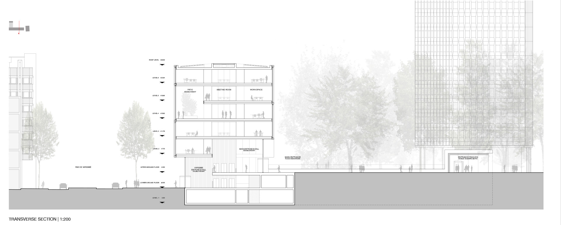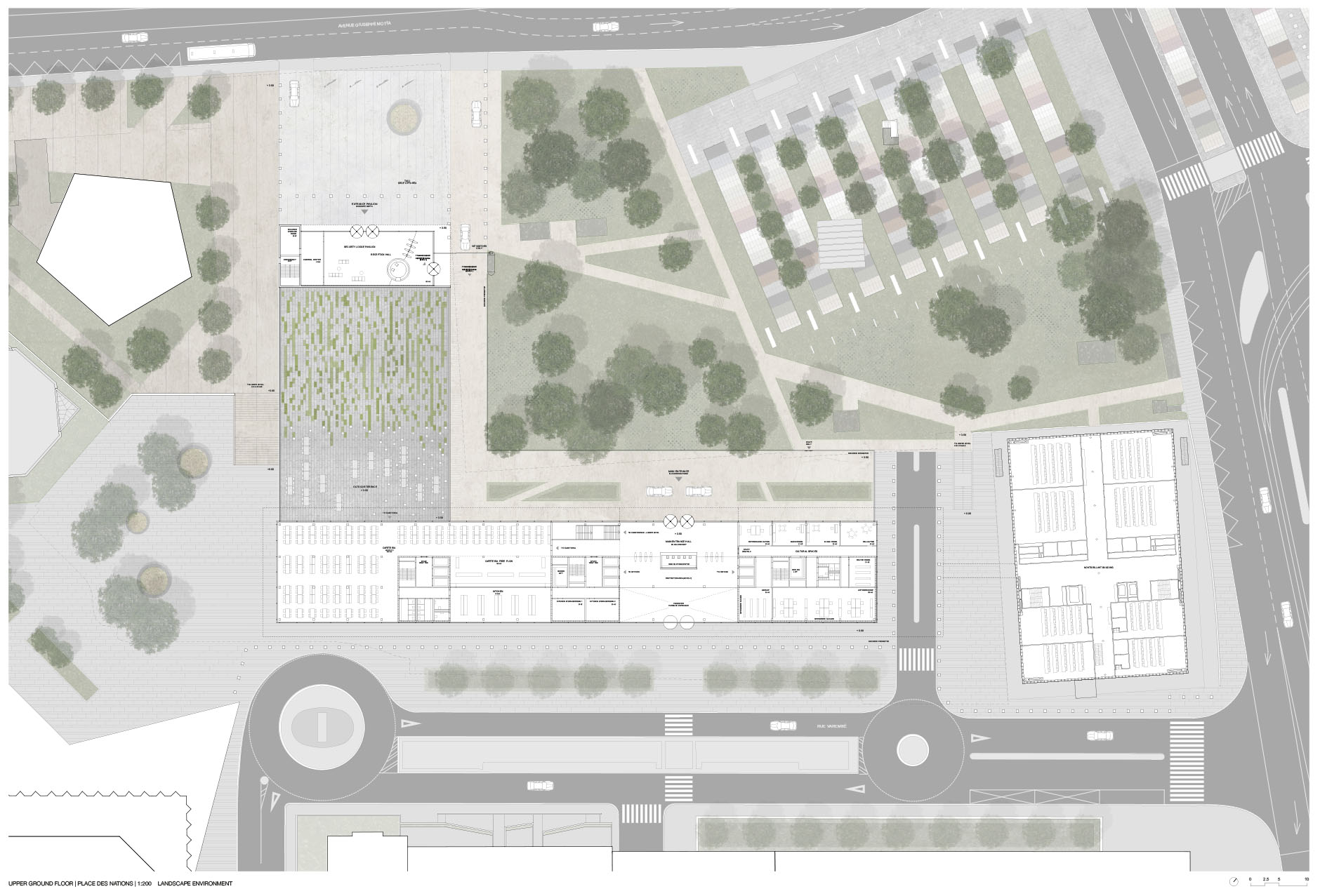 L’insertion et l’émergence proposées souhaitent être en totale harmonie avec la dualité très forte du site existant. Le contexte urbain du lieu est représenté par la rue de Varembé, située au niveau inférieur du périmètre d’intervention. Le contexte paysager du lieu est représenté par l’extension de la place des Nations, située au niveau supérieur du périmètre d’intervention.